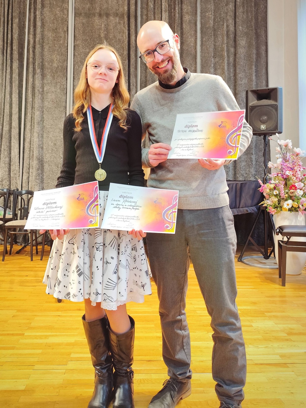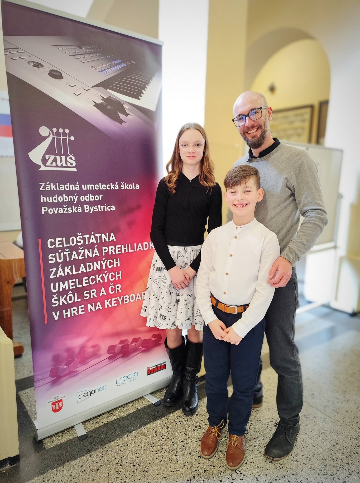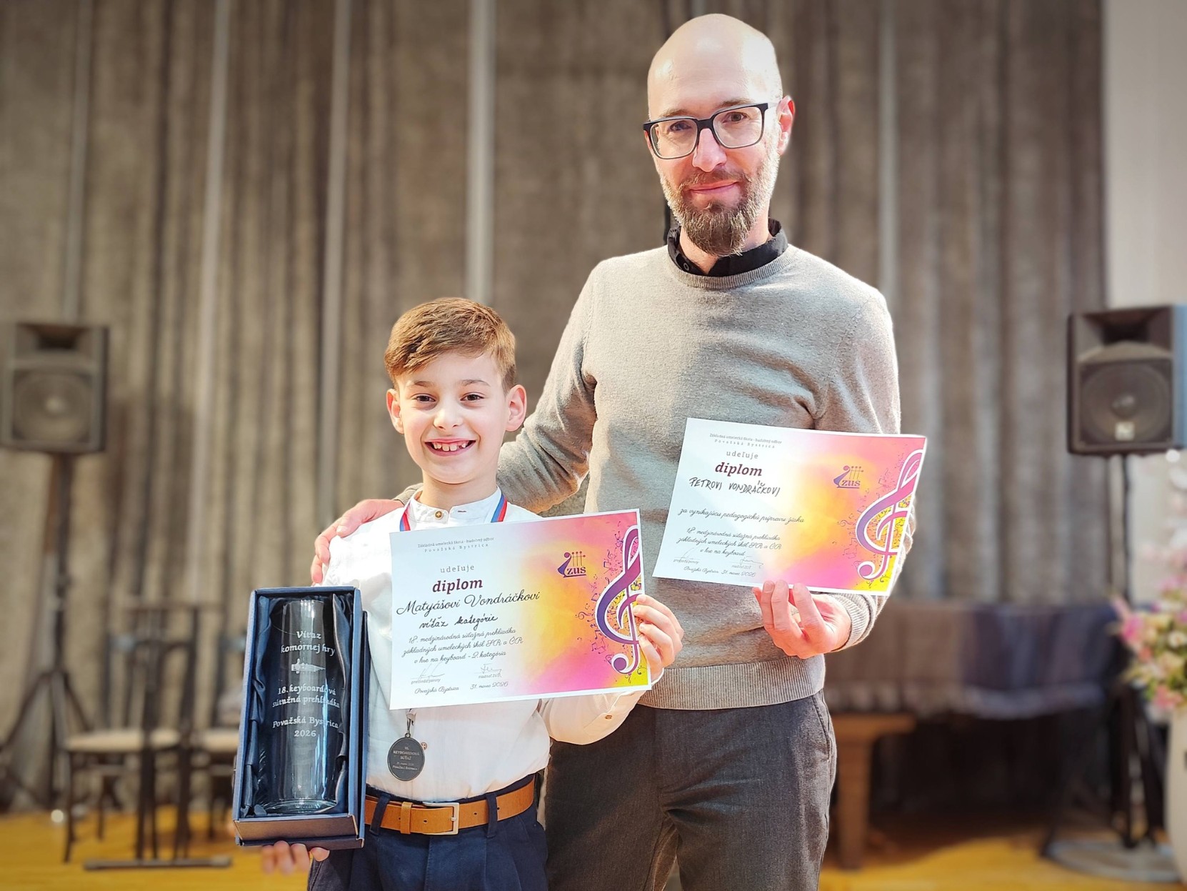 V úterý 31. března 2026 se p. uč. Petr Vondráček se svými žáky účastnil Mezinárodní soutěžní přehlídky ZUŠ SR a ČR ve hře na keyboard, která se každoročně koná v Považské Bystrici. Laureát loňského ročníku soutěže Matyáš Vondráček, dle podmínek klání vzhledem k jeho věku, soutěžil se staršími žáky ve 2. kategorii. Nejenže se mu podařilo získat zlaté pásmo, ale rovnou vyhrál celou kategorii a zároveň vystoupil na koncertě vítězů! Laura Hlávková soutěžila ve 3. kategorii a rovněž získala zlaté pásmo. Navíc zaujala porotu skladbou Fanfare od J. N. Lemmense natolik, že obdržela zvláštní cenu za úpravu a interpretaci této kompozice. Pan učitel Vondráček byl odměněn diplomem za vynikající pedagogickou přípravu žáků. Gratulujeme žákům, učiteli a velké poděkování patří i rodičům za podporu.