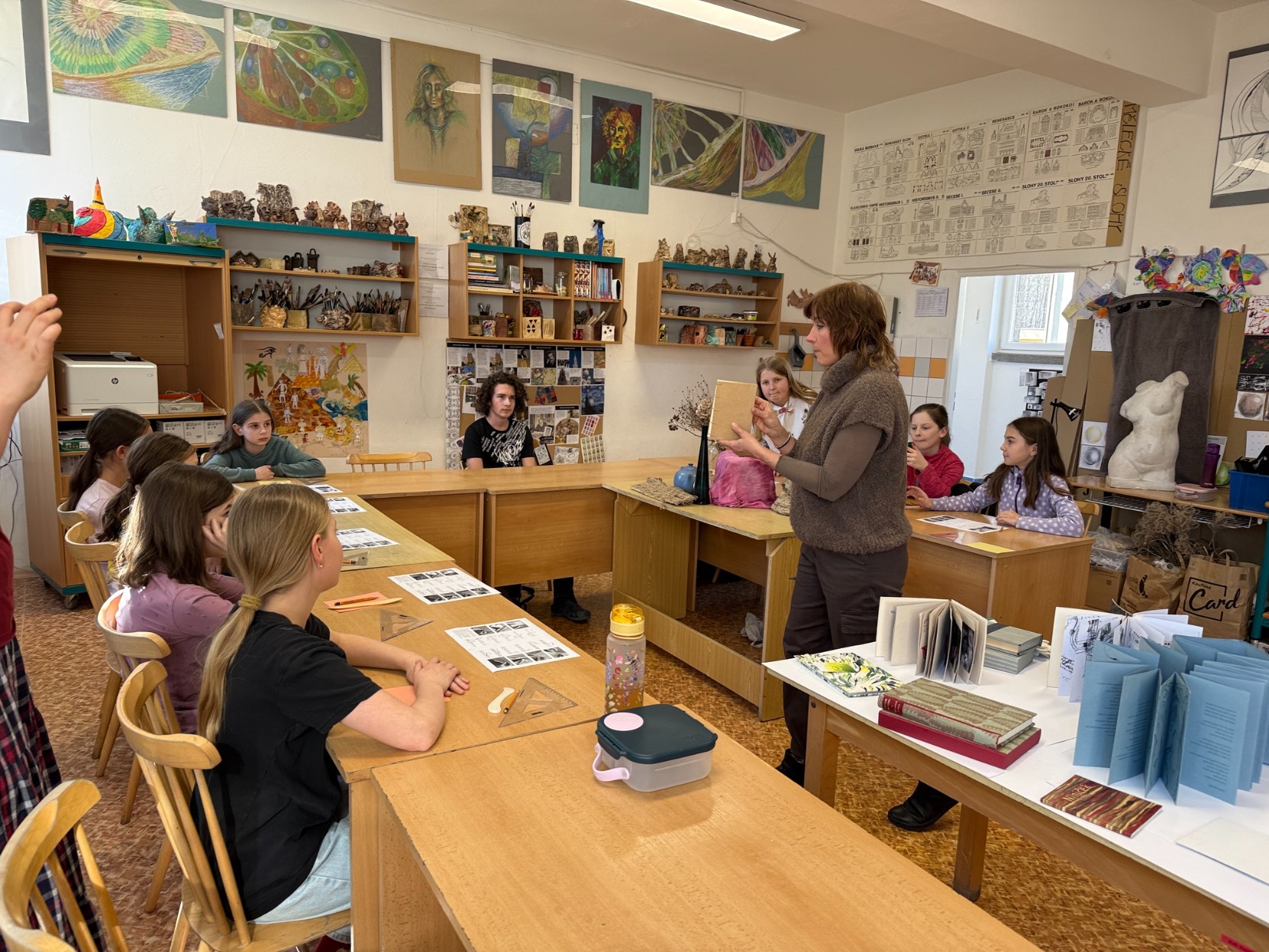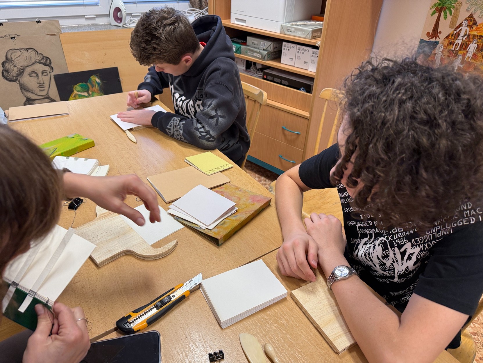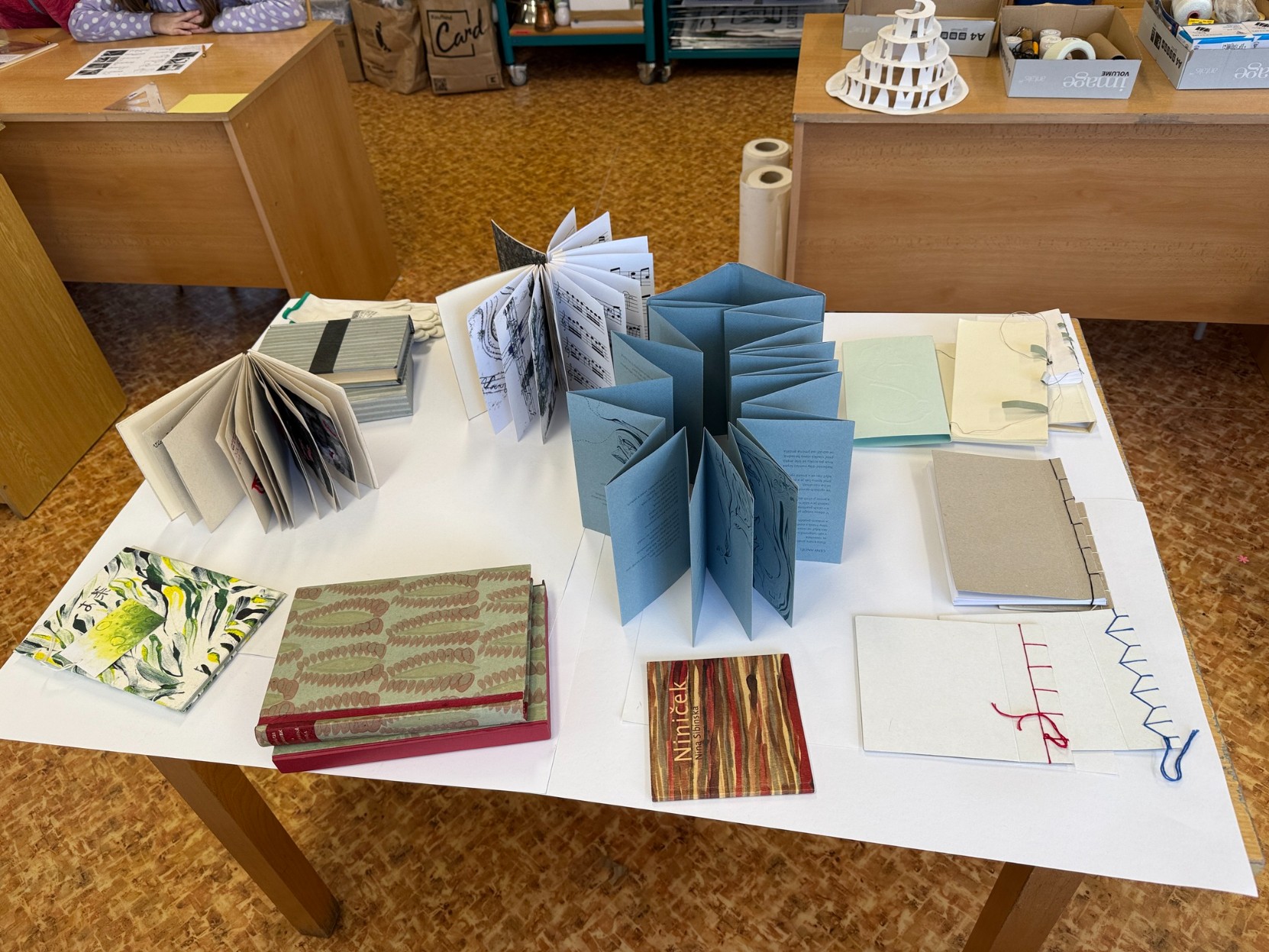 V pátek 6. března se děti z výtvarného oboru věnovaly netradiční výtvarné aktivitě – učily se šít různé druhy knižních vazeb. Během programu si také prohlédly ukázky autorských knih a seznámily se s jejich podobami i možnostmi zpracování. Celá dílna probíhala pod vedením Mgr. Sibinské.